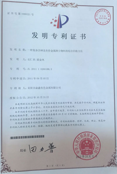 2 | 發(fā)明 | 2011.09.05 | 201110260188X | 一種復雜含砷及有價金屬渣塵物料的綜合回收方法 |